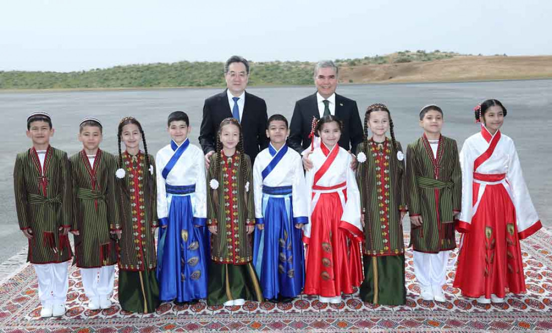 Soňra türkmen halkynyň Milli Lideri we hytaý wekiliýetiniň ýolbaşçysy bilelikde desganyň düýbüni tutmak üçin taýýarlanan ýere bardylar. Bu ýerde milli lybasly çagalar Türkmenistanyň Halk Maslahatynyň Başlygyndan we hormatly myhmandan desganyň düýbüni tutup bermeklerini haýyş etdiler.
